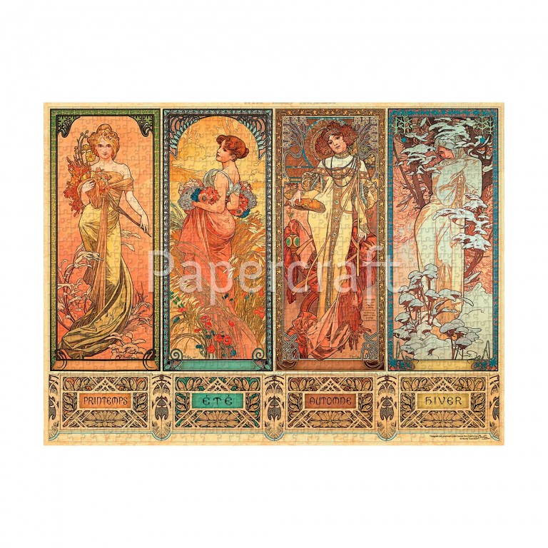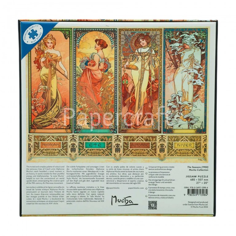 Smyslné ženské postavy patřily mezi klíčové prvky Muchova vizuálního lexikonu, který zahrnoval také harmonickou kompozici, stylizované zobrazení přírodního světa a úctu k byzantské kultuře. Umělecké dílo na puzzle Roční období (1900) je replikou čtyř panelů s motivy jara, léta, podzimu a zimy z této mimořádně populární série. Jsme potěšeni, že můžeme ve spolupráci s Muchovou nadací přinést toto společné označení do kolekce Paperblanks.