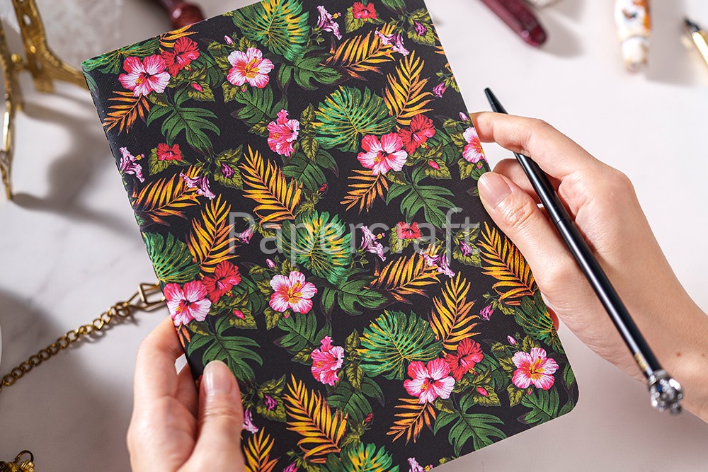 Návrh vazby Nani s bujnými tropickými květinami Havaje evokuje jak tradiční ručně malované vzory, tak i moderní potištěné látky a na stránky uvnitř vnáší atmosféru aloha. V havajštině znamená nani „krásný“ nebo „příjemný“ a doufáme, že tento bohatý květinový vzor vnese do vašeho života pocit krásy a radosti.